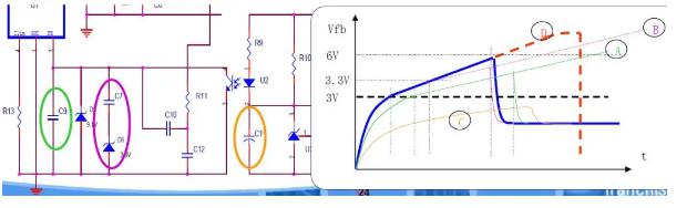 IC的OCP功效是檢測Vfb到達Vsd(如6V)完成的。以是要降落Vfb斜率,就可以或許或許耽誤Vfb的回升時辰。